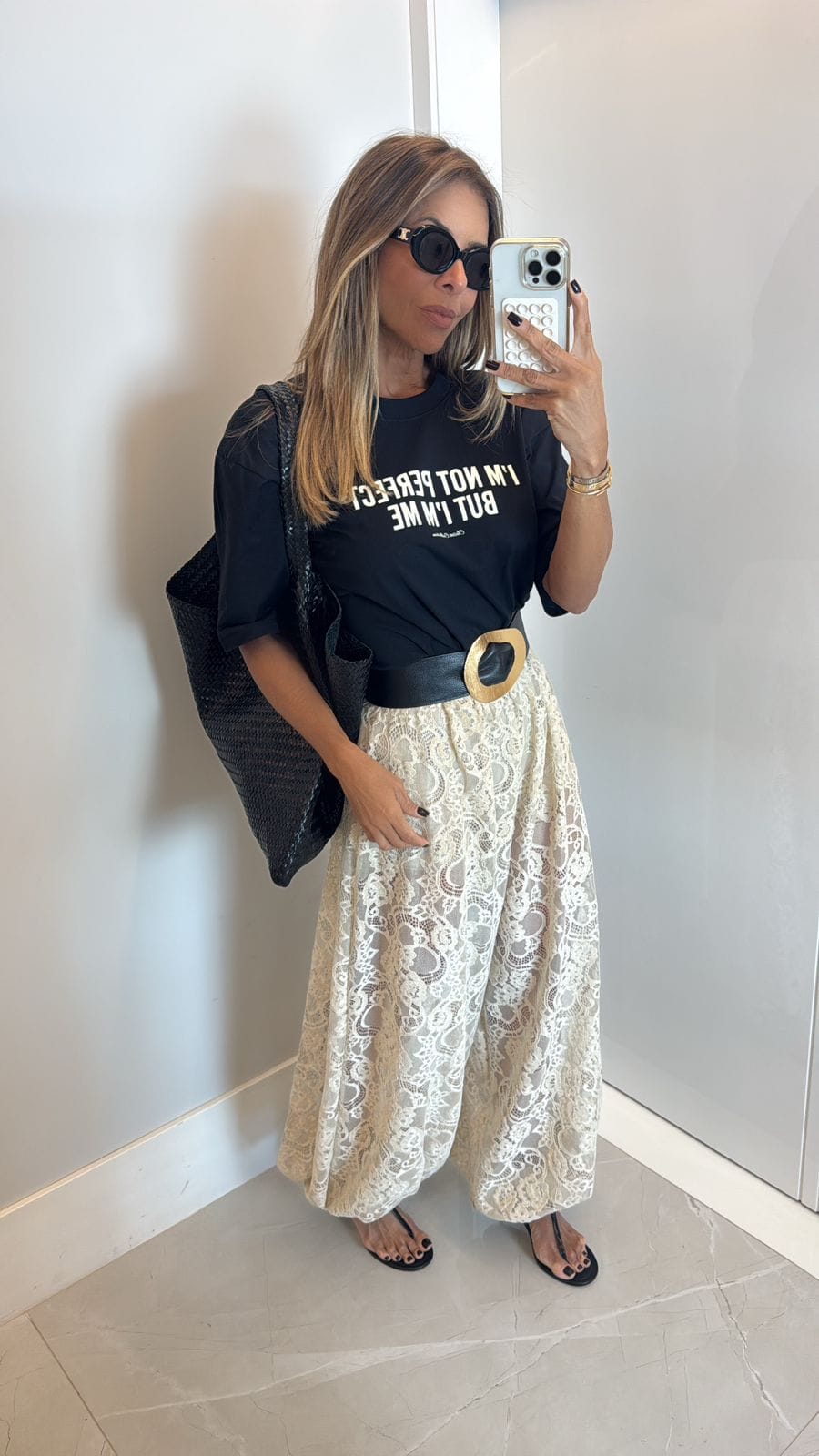 O tom marfim adiciona um ar romântico e atemporal, perfeito para produções diurnas ou noturnas. Combine com croppeds, camisas ou t-shirts para um look moderno e refinado.
