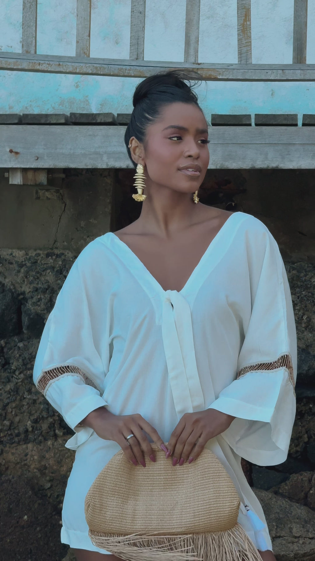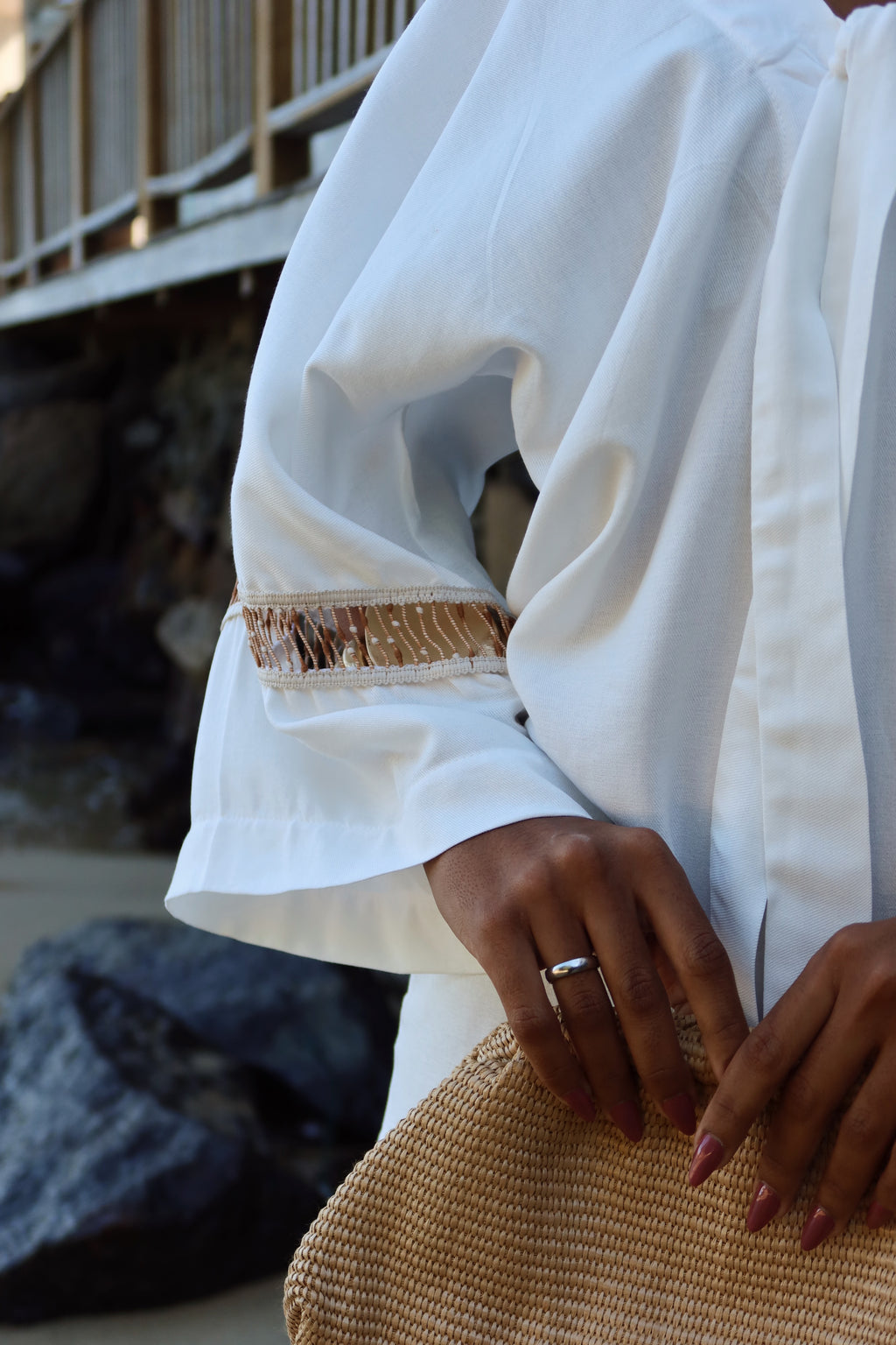 - Mangas amplas com detalhe vazado em trama