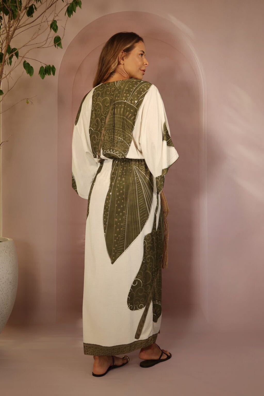 O Vestido Raiz Solar combina frescor e sofisticação em uma só peça.Feito em viscose leve com toque suave, ele possui modelagem fluida com decote e amarração no pescoço, que realça o colo e as costas de forma elegante.A estampa exclusiva em arabescos verde-oliva transmite a essência da natureza e o charme do entardecer — ideal […]