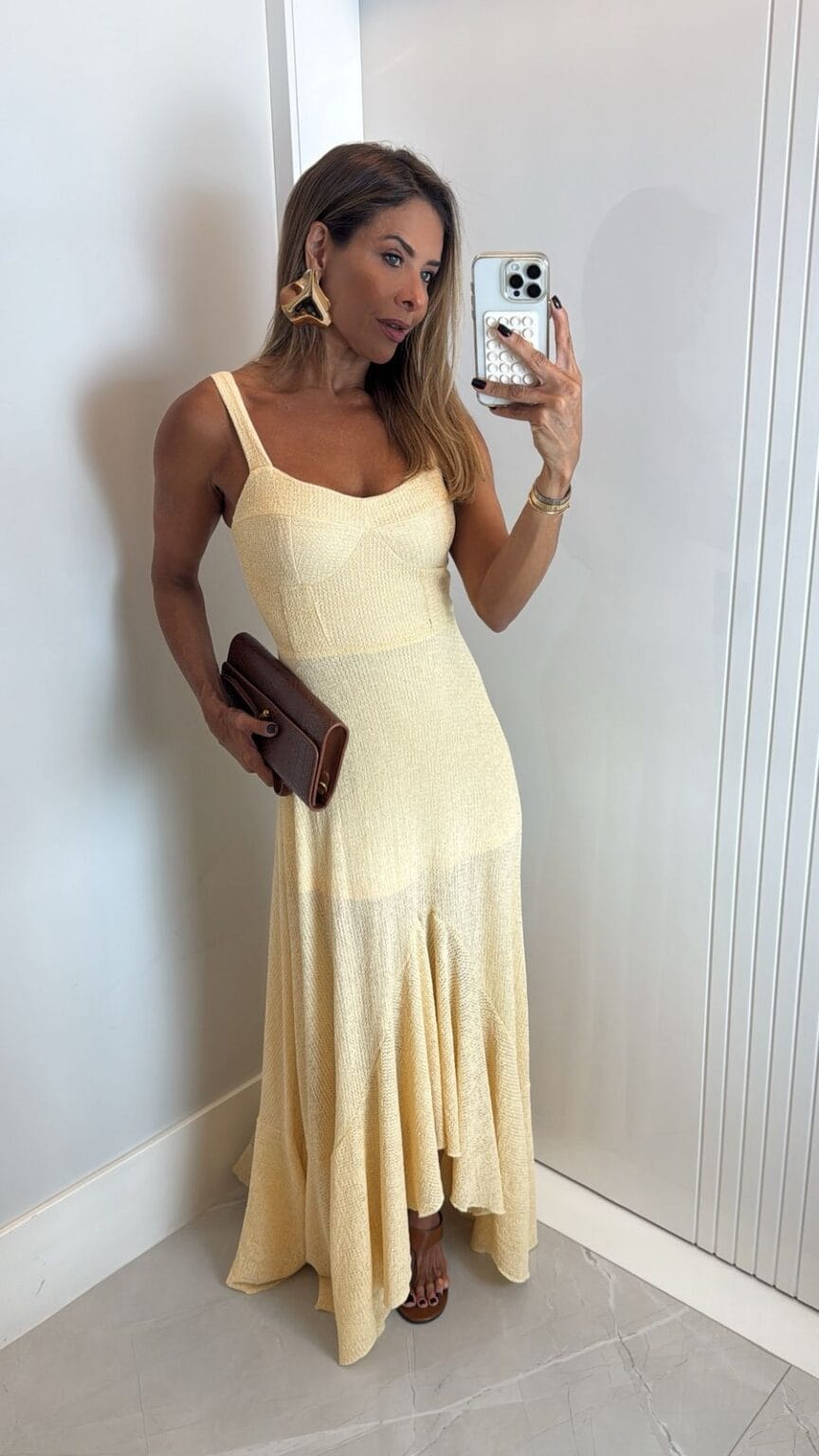 Destaques: Tecido com textura e caimento leve Modelagem acinturada que realça a silhueta Saia fluida com movimento natural Decote estruturado com alças médias Ideal para eventos, jantares e ocasiões especiais O Doce Brisa é aquele vestido que une romantismo e elegância de forma atemporal — perfeito para mulheres que amam se sentir leves, seguras e sofisticadas.