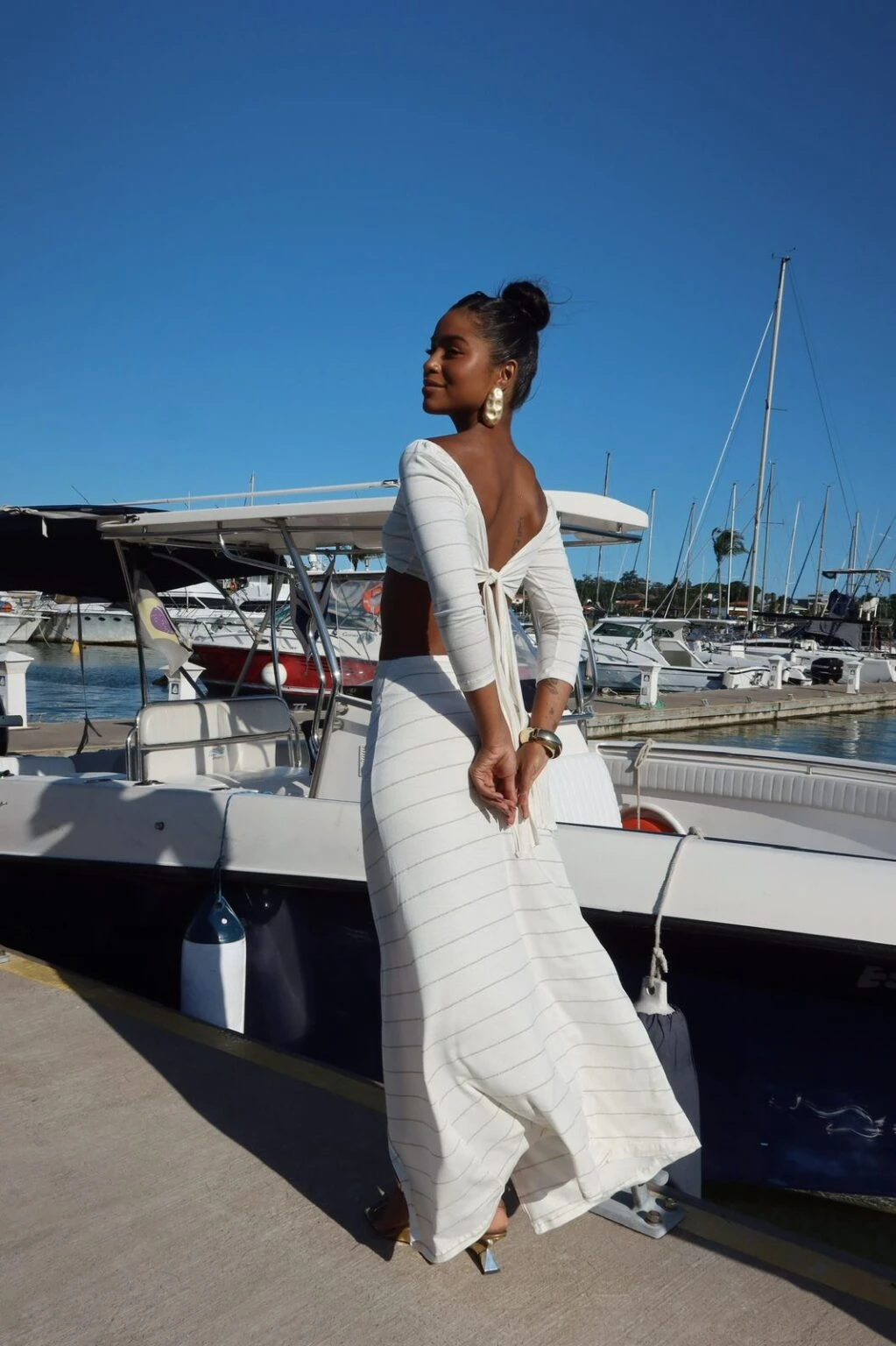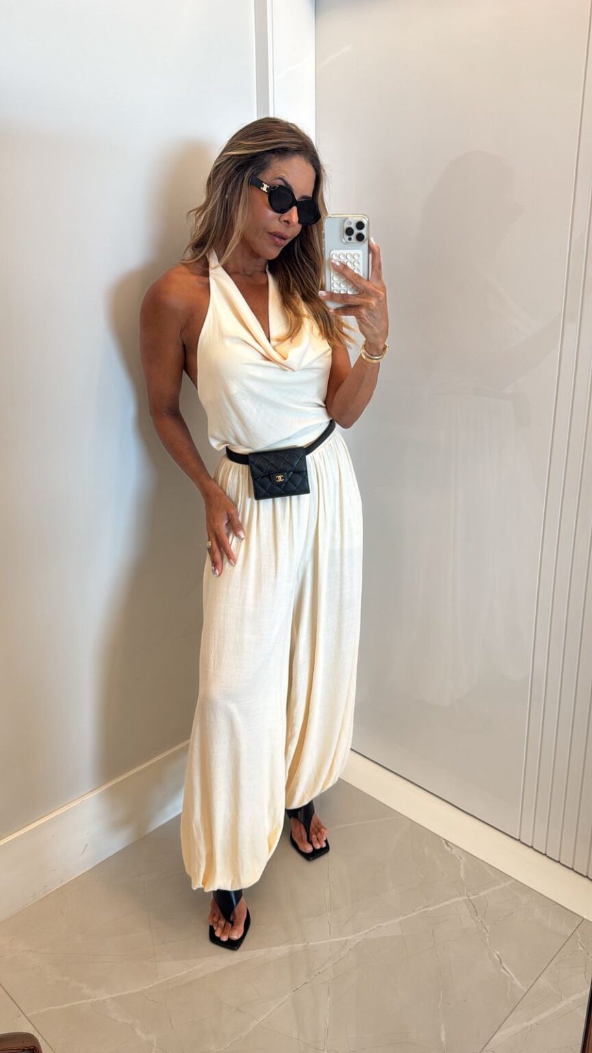 O conjunto foi criado para mulheres que querem brilhar com elegância em qualquer ocasião. Confeccionado em tecido leve com listras sutis, o look combina modernidade, conforto e um toque sofisticado que é a assinatura da estética resort chic. O cropped possui decote franzido com aplicação central que ilumina o colo, mangas longas ajustadas e amarração nas costas, criando um visual sensual e equilibrado. A saia longa tem caimento fluido, fenda frontal e detalhe de torção com aplicação, valorizando a cintura e alongando a silhueta com naturalidade. O resultado é um conjunto imponente, leve e extremamente feminino — perfeito para sunsets, jantares à beira-mar, viagens e ocasiões especiais.