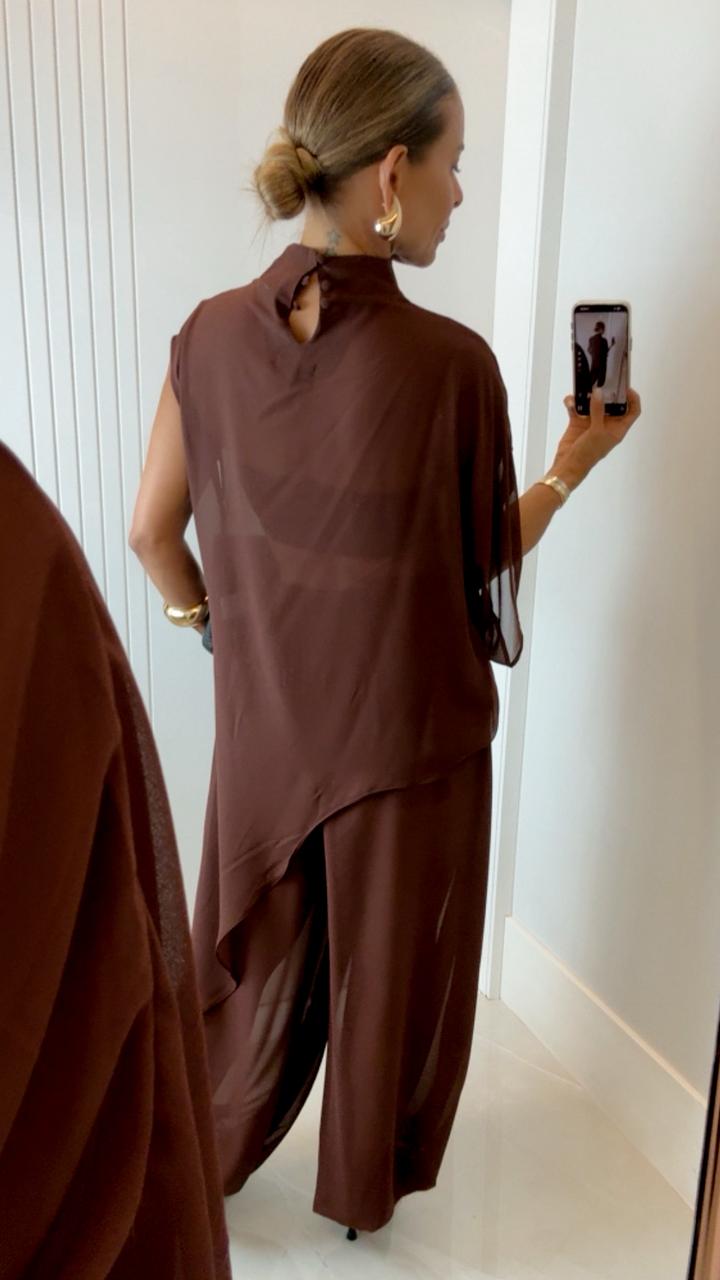 O Conjunto Cristal confeccionado em chiffon possui blusa gola alta com fechamento delicado nas costas e barra assimétrica.