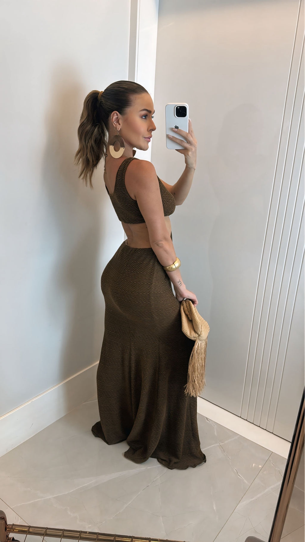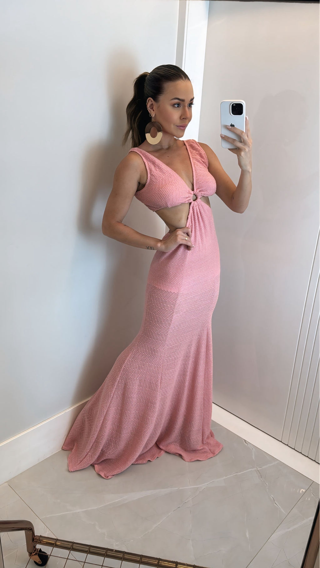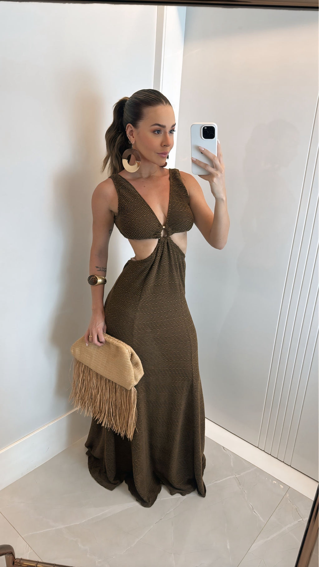 O vestido Sanibel possui decote V profundo, detalhe torcido frontal com argola central, recorte lateral que valoriza a cintura e modelagem levemente evasê que proporciona fluidez e movimento.