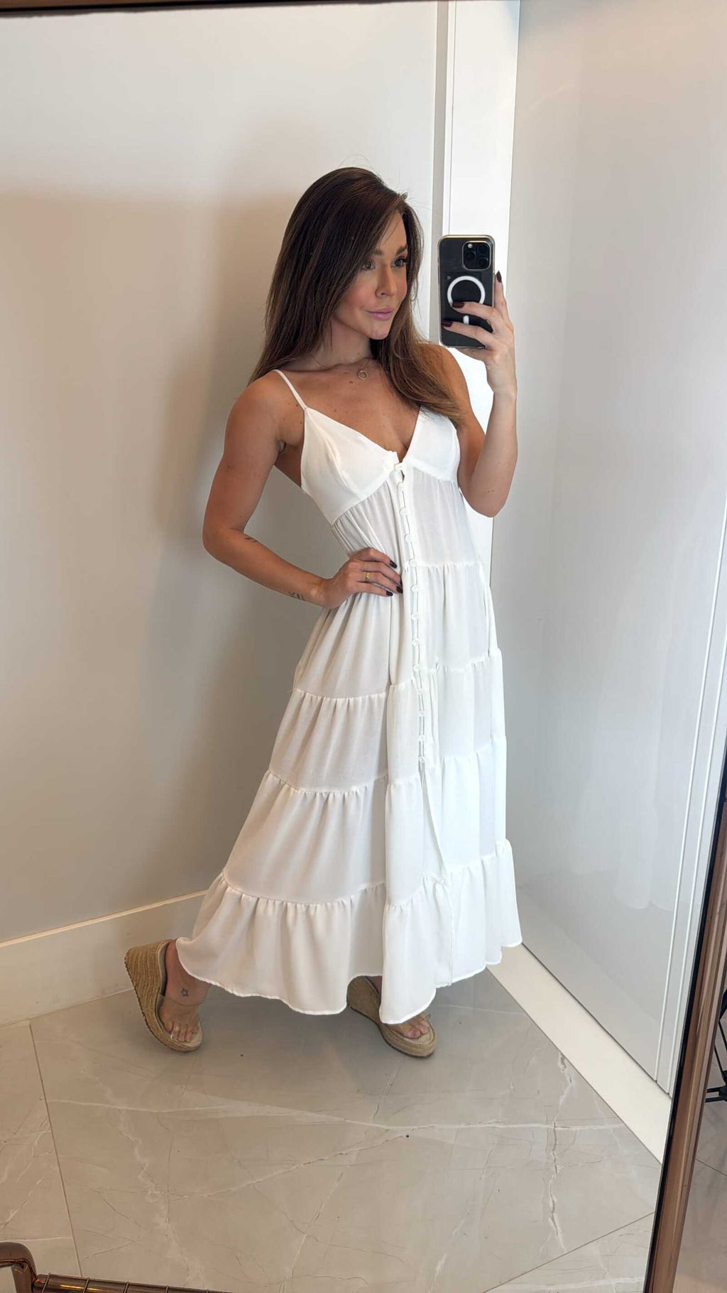 Os botões frontais alongam a silhueta, enquanto a combinação de branco e azul adiciona charme atemporal e versátil.