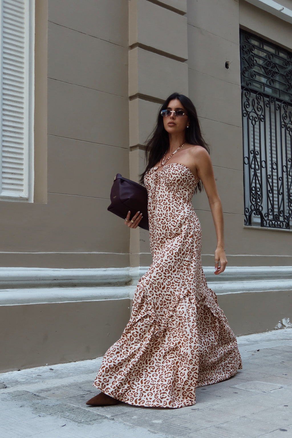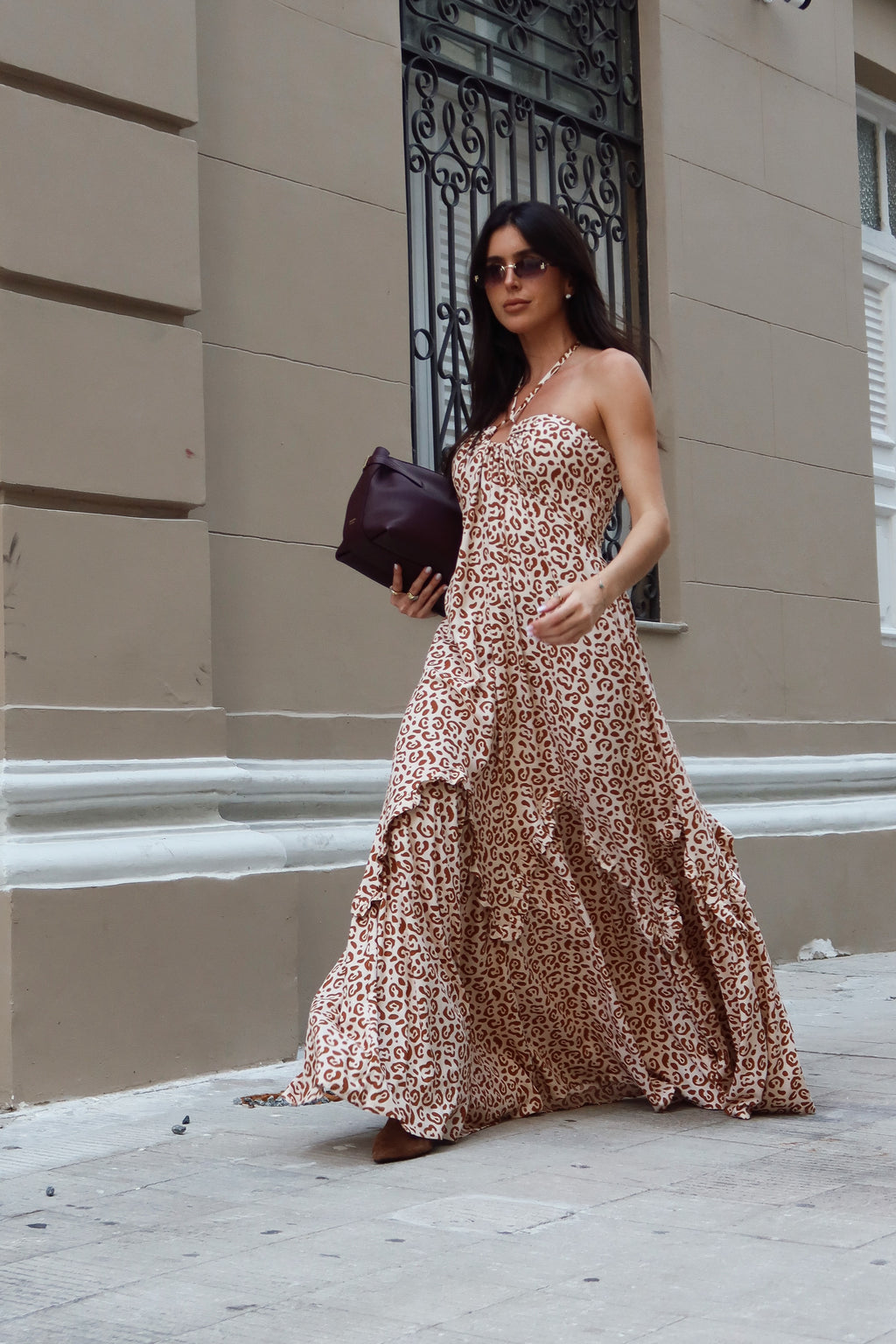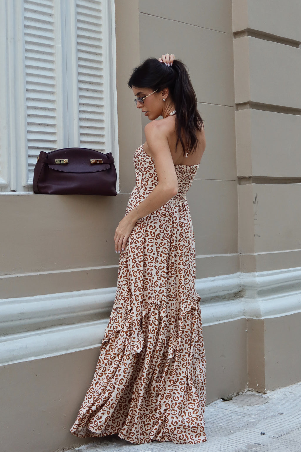 O Vestido Areia Pintada possui modelagem evasê soltinha, amarração no pescoço e estampa animal print para um visual mais sexy.