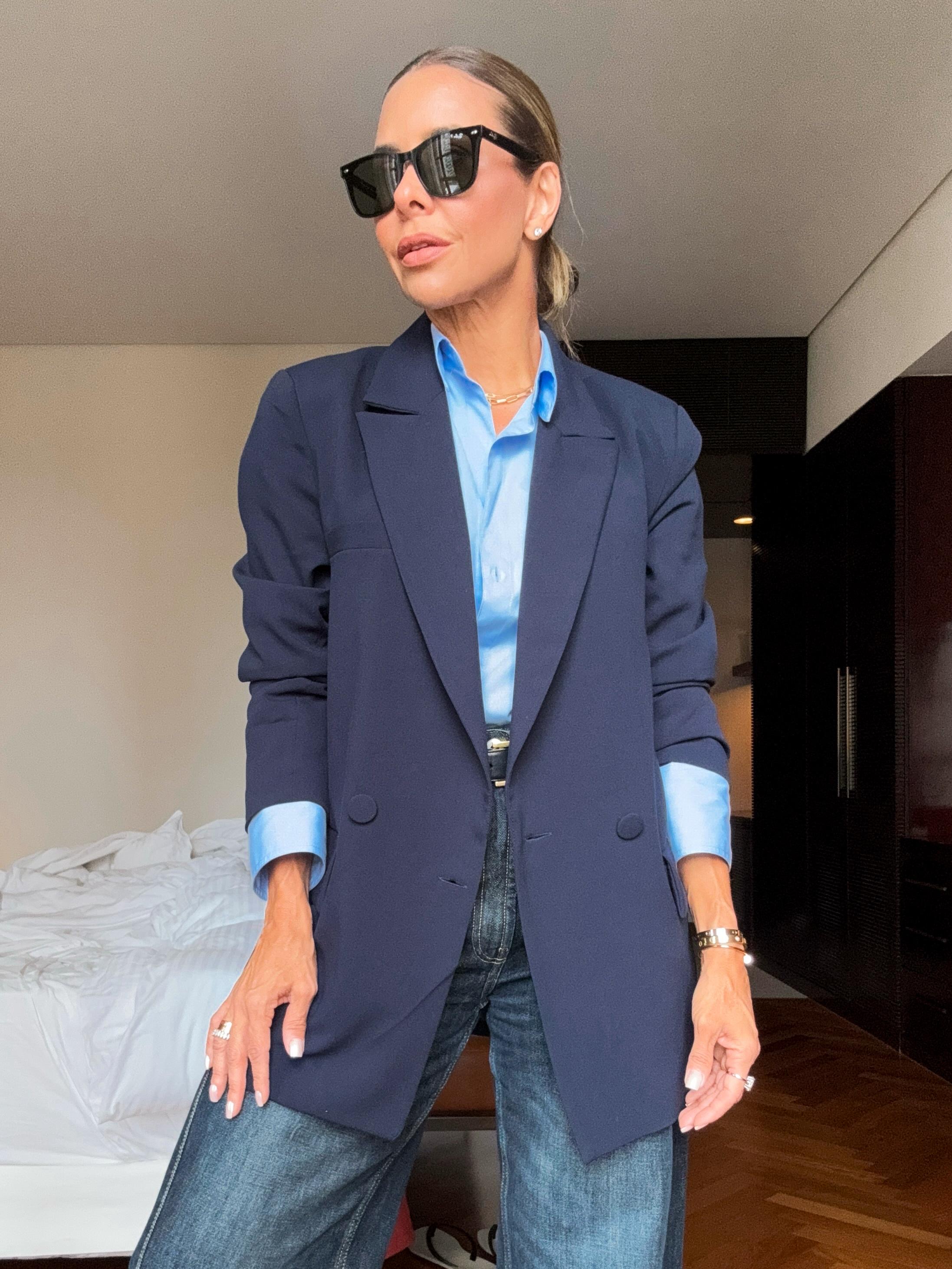 Elegante e atemporal, o Blazer Alfaiataria Navy é a escolha perfeita para composições modernas e sofisticadas. Confeccionado em tecido estruturado, possui modelagem alongada, ombreiras leves e fechamento frontal com botões forrados que valorizam o caimento.