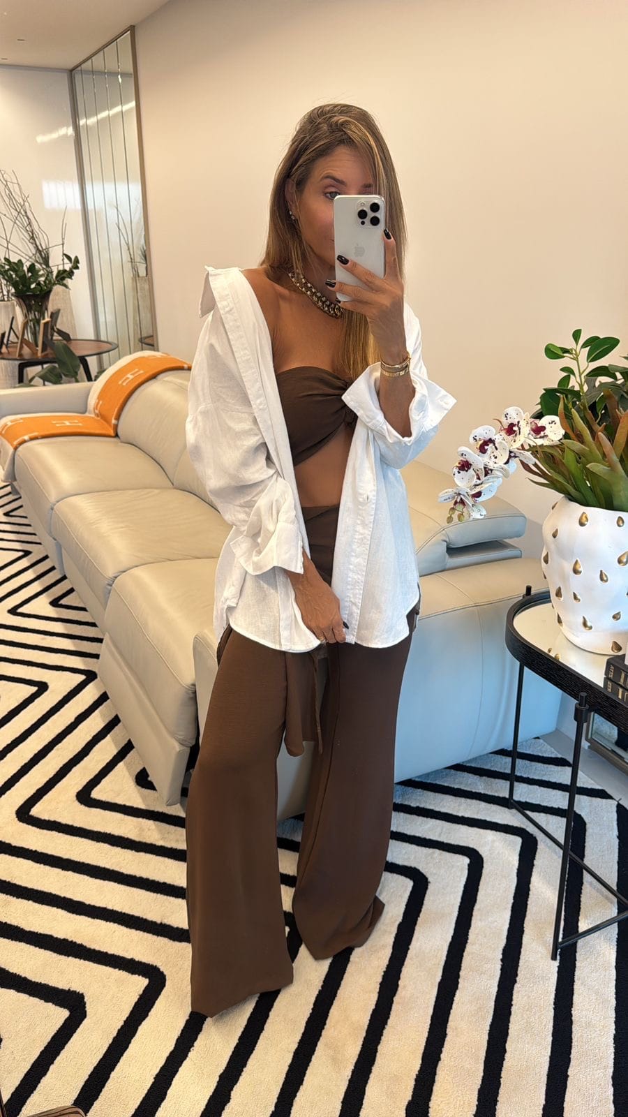 A calça de cintura alta com amarração lateral e modelagem pantalona garante caimento fluido e sofisticado, valorizando a silhueta com leveza e movimento. Ideal para compor desde looks casuais chiques até produções mais elaboradas para eventos ao ar livre ou viagens.