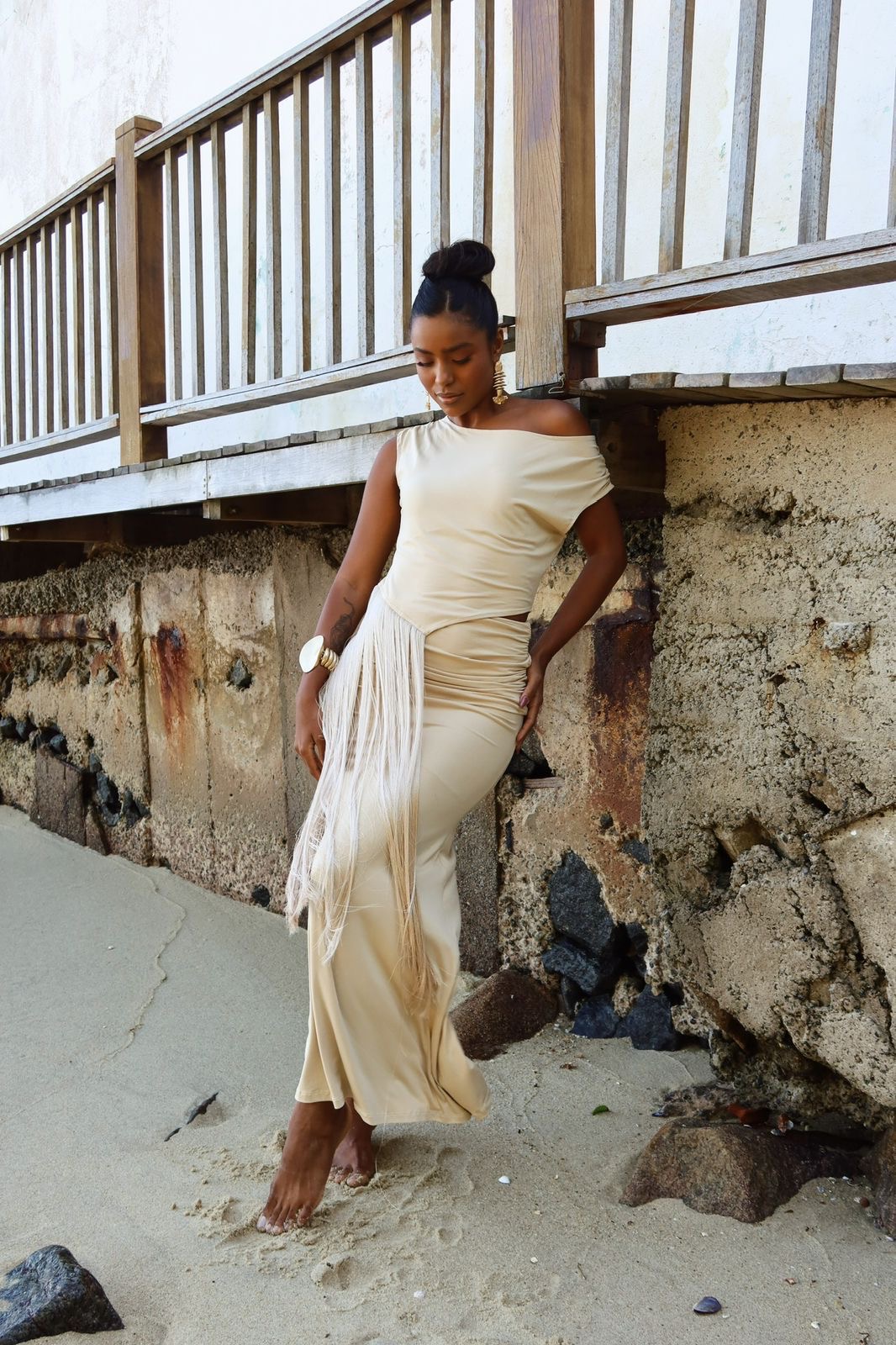 A blusa possui franjas longas que dançam com o vento, trazendo um efeito visual único e elegante. A saia longa complementa com fluidez, criando uma silhueta alongada e feminina — ideal para sunsets, festas à beira-mar, viagens e eventos especiais.