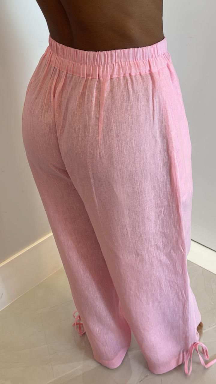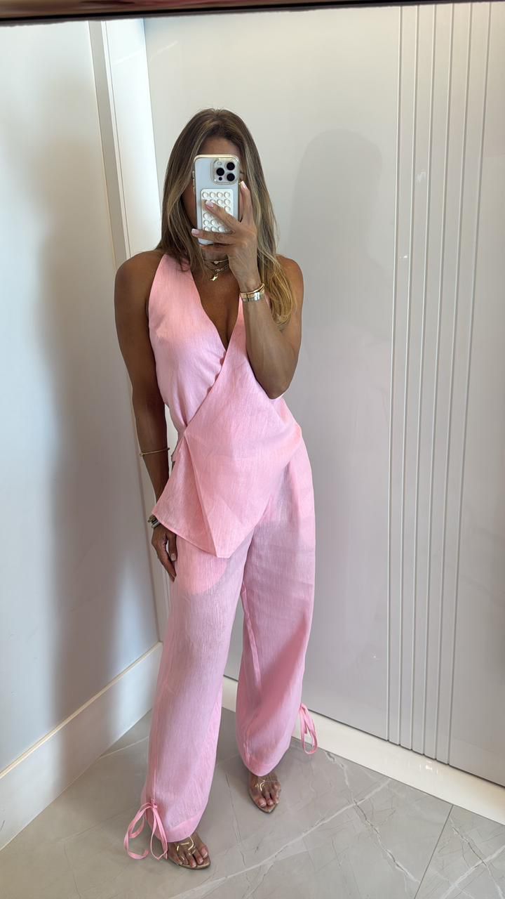 A blusa transpassada possui decote alongado que valoriza o colo, criando um visual feminino e contemporâneo. Já a calça em linho 100% natural apresenta cintura média e amarrações suaves nos tornozelos, trazendo charme e movimento ao look.