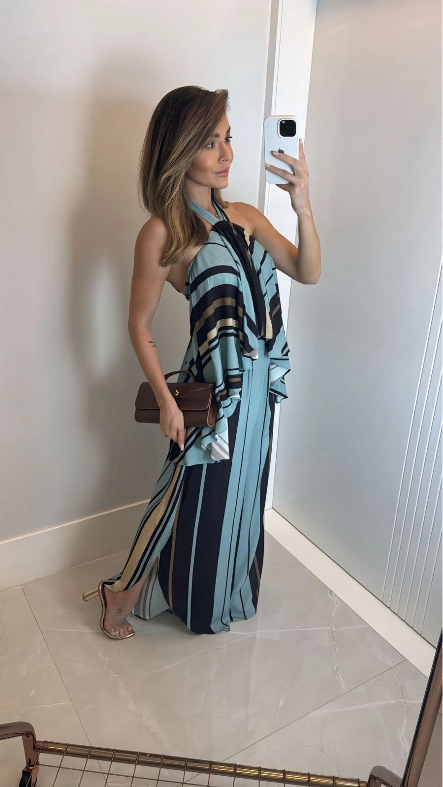 O Conjunto Listras Orla é a escolha perfeita para quem busca elegância sem esforço. Confeccionado em viscose fluida, traz blusa com gola halter e amarração no pescoço, além de calça de cintura alta e modelagem ampla que alonga a silhueta. A estampa exclusiva Listras Orla imprime sofisticação e frescor, ideal para composições urbanas ou resort chic.
