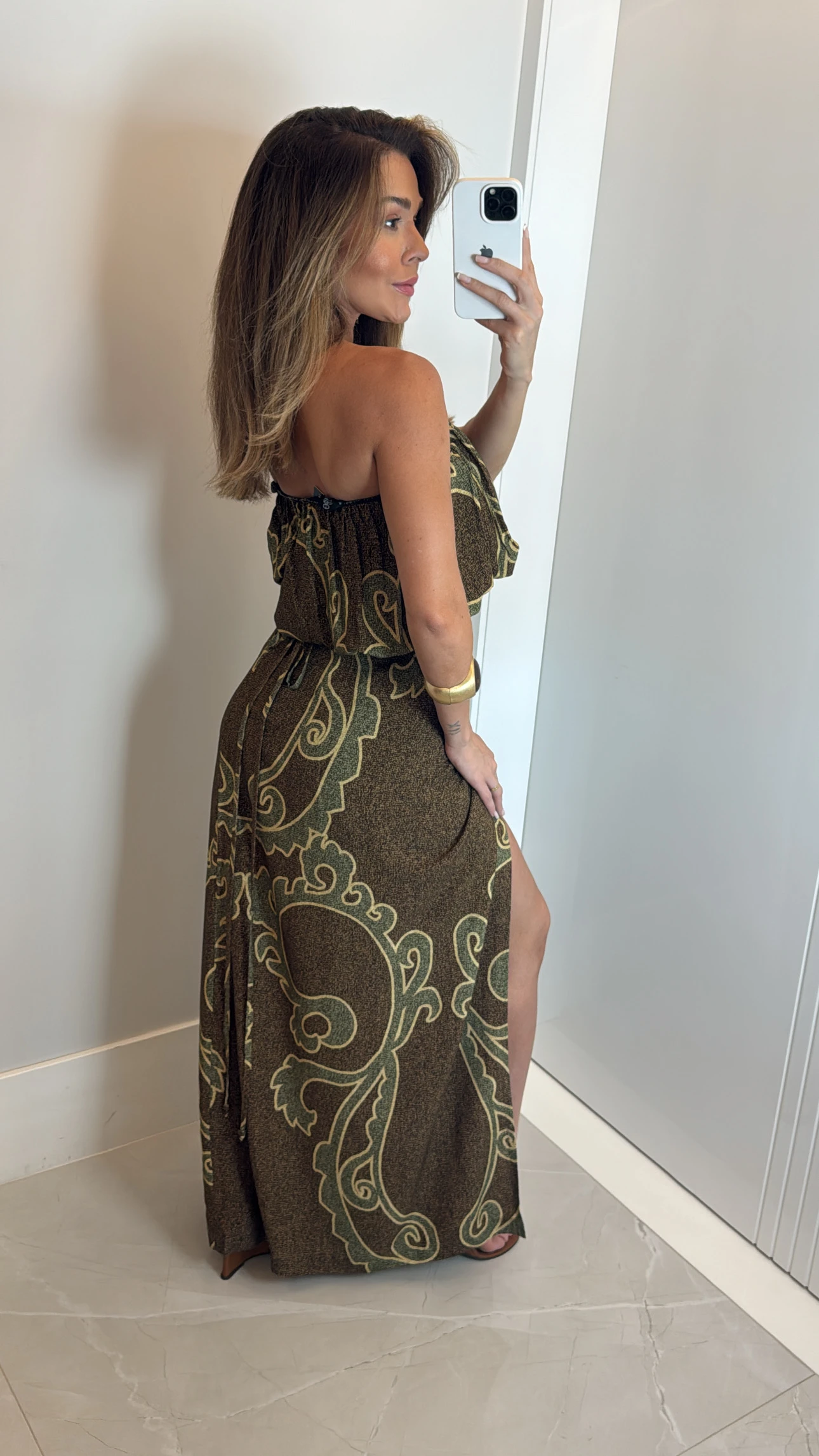 O Conjunto Raiz Solar é a união perfeita entre leveza e elegância natural. Confeccionado em viscose fluida e fresca, ele traz top tomara que caia com babado delicado e saia longa estilo pareô, que pode ser ajustada e amarrada de diferentes formas, valorizando a cintura e trazendo versatilidade ao look. Com estampa exclusiva em arabescos verde-oliva sobre fundo terroso, é uma peça que transmite o conceito da coleção: o equilíbrio entre o sofisticado e o natural. Perfeito para dias ensolarados, viagens ou eventos ao ar livre — um look leve, elegante e autêntico como você.