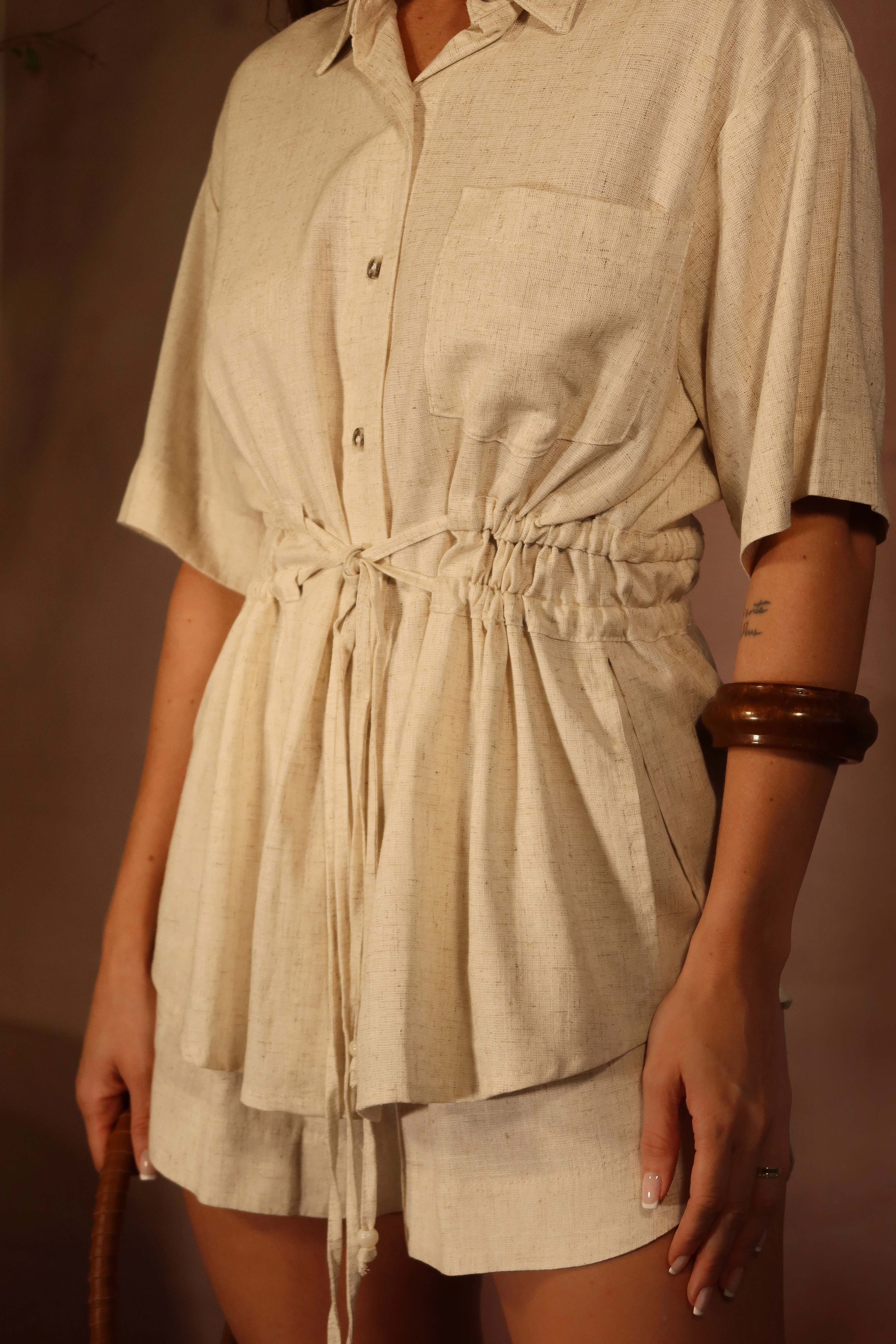 Conjunto em viscolinho com camisa ajustável e short com cós elástico. Elegância e conforto em cada detalhe.