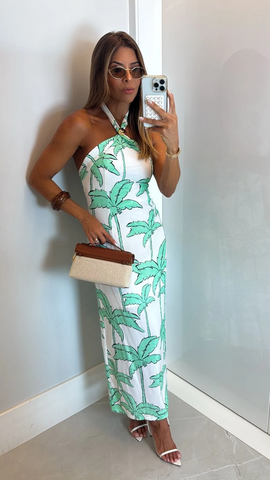 O Vestido Longo PUPUNHA é sinônimo de leveza e elegância natural. Produzido em viscose de alta qualidade, com estampa tropical exclusiva, possui decote com amarração no pescoço, costas abertas e modelagem fluida, proporcionando um caimento perfeito. Ideal para eventos ao ar livre e produções resort.