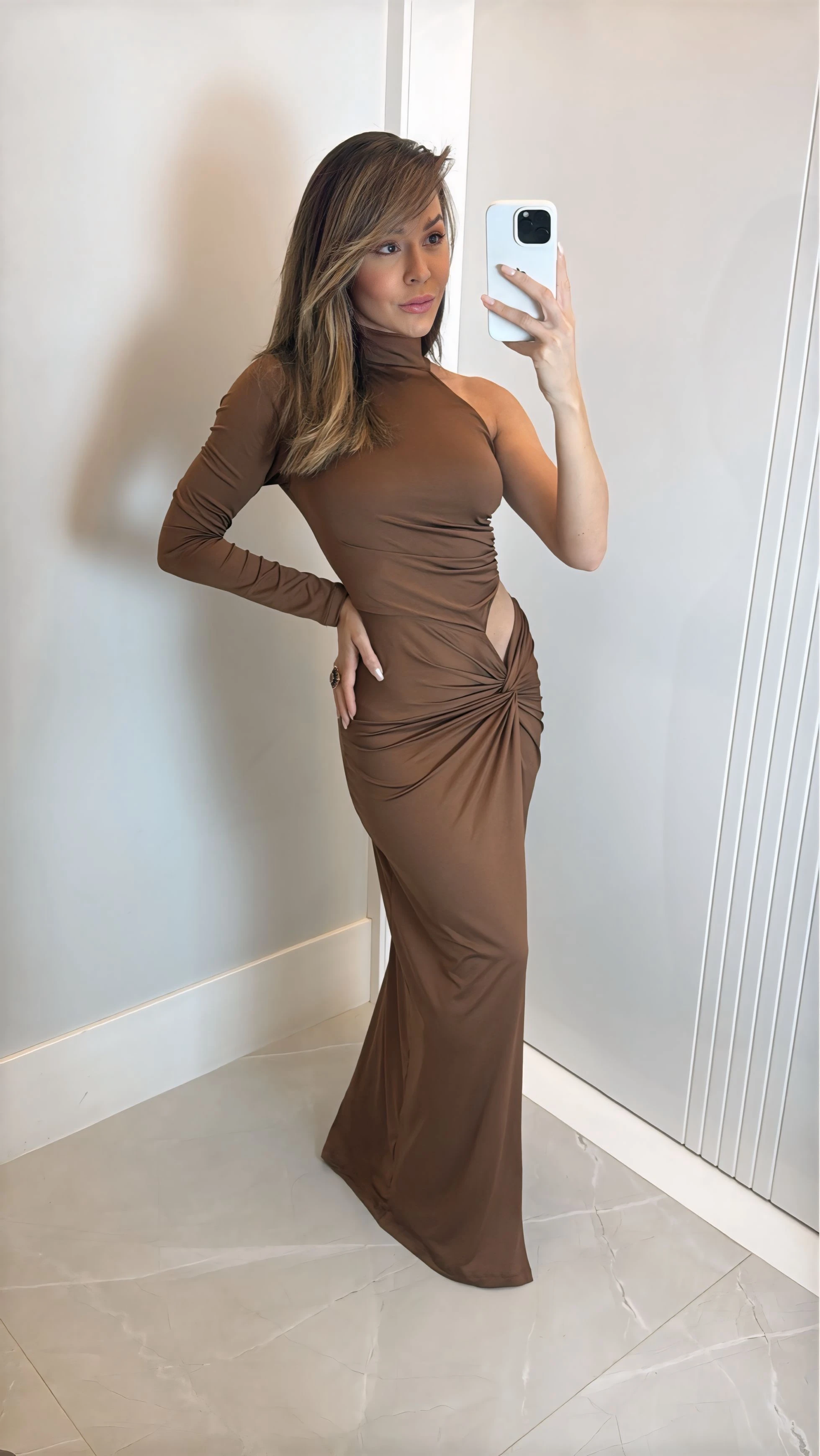 O Vestido Longo Magna é uma peça impactante e sofisticada, perfeita para mulheres que desejam unir elegância e atitude em um look único. Com modelagem assimétrica de uma manga só e recorte lateral estratégico, ele valoriza a silhueta com modernidade e sensualidade na medida certa.