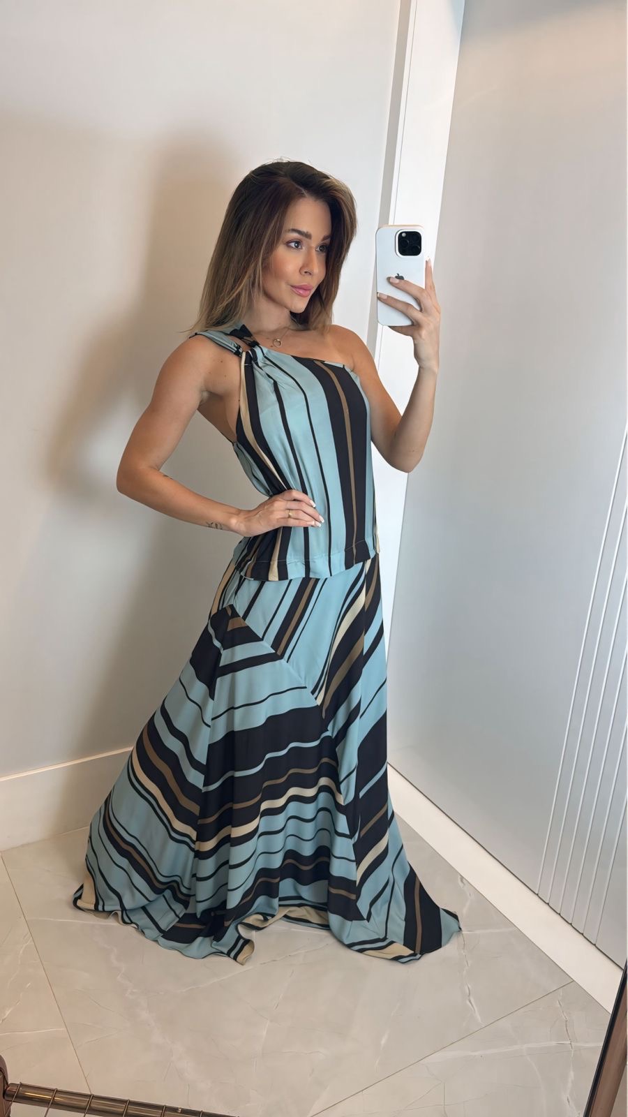 Vestido longo em viscose leve com decote de um ombro só e estampa listrada exclusiva.