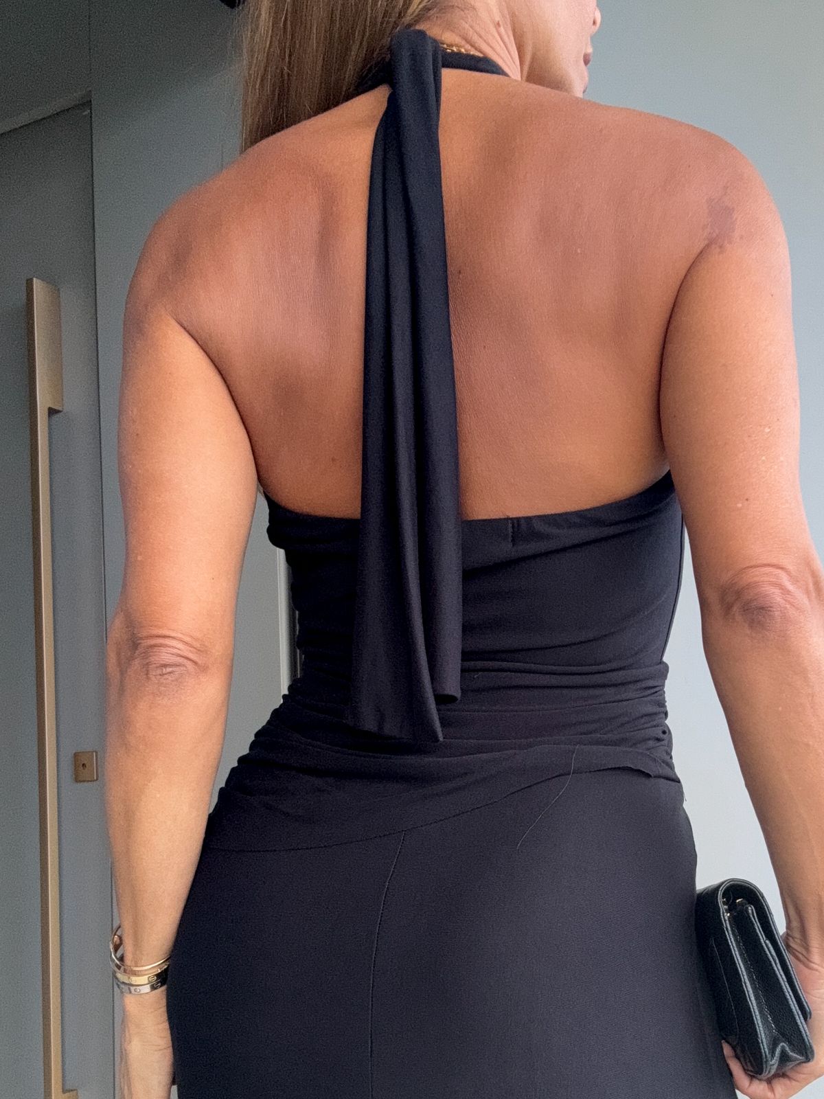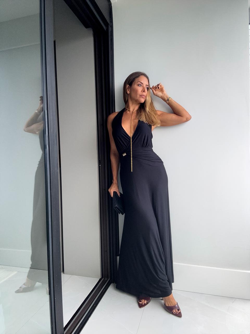 O modelo apresenta decote profundo em V com torção frontal e drapeado na cintura, que realça as curvas de forma sutil e elegante. O comprimento mídi fluido confere movimento e equilíbrio à peça, enquanto o modelo halter com amarração no pescoço e costas abertas trazem um toque de sensualidade na medida certa.