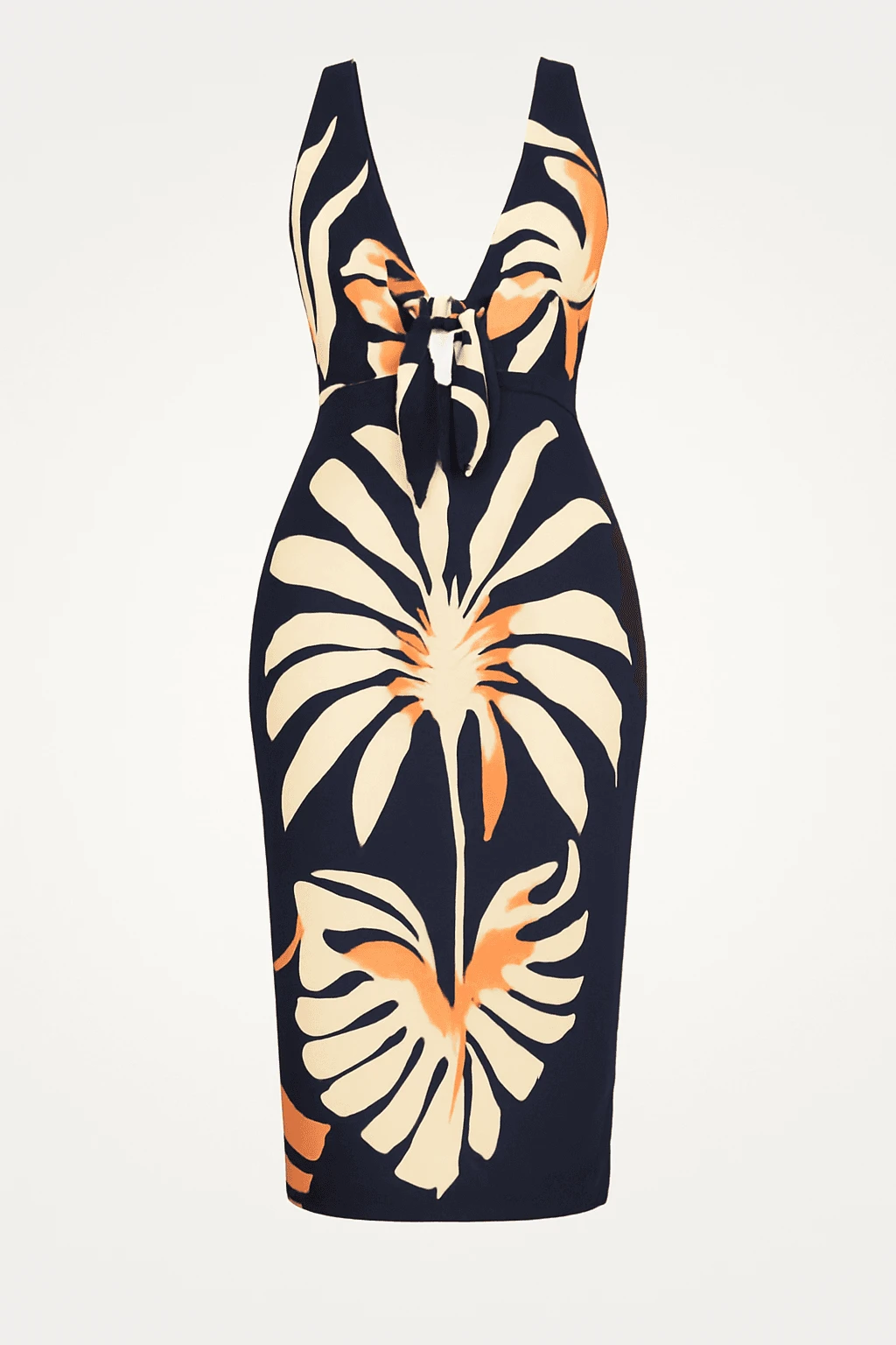 O modelo apresenta decote profundo em V com detalhe de amarração na frente, que valoriza a silhueta e adiciona charme ao visual. A modelagem midi ajustada ao corpo garante caimento impecável, enquanto a estampa maxi de folhagens traz personalidade e modernidade à produção.